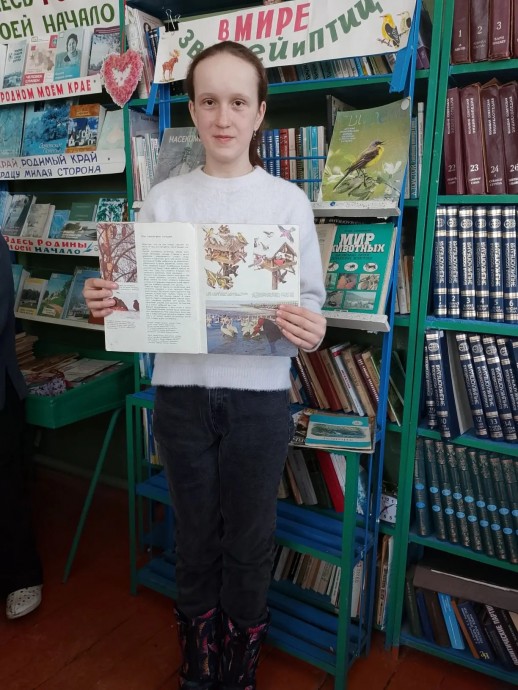 Заведующая библиотекой Карпушина В.И. рассказала детям о видах птиц, об их повадках, о бережном отношении человека к ним в разное время года. Также дети узнали интересные факты из жизни птиц, о том какую пользу они приносят человеку. Говорили о том, как надо помогать птицам в зимнее время года и как встречать перелетных птиц весной.